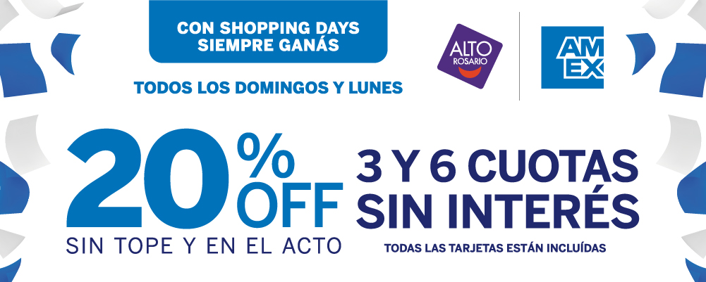 EXCLUYE TARJETAS EMITIDAS POR TARJETA NARANJA S.A. BENEFICIO VÁLIDO EN LA REPÚBLICA ARGENTINA LOS DOMINGOS Y LUNES DESDE EL 02/11/2025 HASTA EL 29/12/2025 INCLUSIVE, PARA LOS SOCIOS TITULARES Y ADICIONALES DE LAS TARJETAS PERSONALES Y CORPORATIVAS DE AMERICAN EXPRESS, EMITIDAS Y ADMINISTRADAS POR: (I) AMERICAN EXPRESS ARGENTINA S.A. Y (II) LOS BANCOS AUTORIZADOS, A SABER: BANCO MACRO S.A., HSBC BANK ARGENTINA S.A., BANCO SANTANDER RÍO S.A., BANCO GALICIA Y BUENOS AIRES S.A., BANCO PATAGONIA S.A. Y REBA, LA APP DE TRANSATLÁNTICA COMPAÑÍA FINANCIERA S.A. (LOS “SOCIOS” Y LAS “TARJETAS”). LOS SOCIOS ACCEDERÁN A UN 20% DE DESCUENTO SIN TOPE Y EN EL ACTO Y A 3 Y 6 CUOTAS SIN INTERÉS EN MARCAS PARTICIPANTES, ABONANDO LA TOTALIDAD DE LA COMPRA CON LAS TARJETAS. BENEFICIO NO ACUMULABLE CON OTRAS PROMOCIONES NI LIQUIDACIONES. BENEFICIO NO VÁLIDO PARA COMPRAS REALIZADAS A TRAVÉS DE PLATAFORMAS DE PAGOS Y/O AGREGADORES. VÁLIDO PARA TODOS LOS PRODUCTOS. PARA MÁS INFORMACIÓN Y CONDICIONES O LIMITACIONES APLICABLES, CONSULTE EN https://www.americanexpress.com/es-ar/beneficios/promociones/promo/shopping-days/. LAS COMPRAS CON PLAN DE PAGOS ESTÁN SUJETAS AL LÍMITE DE CRÉDITO DISPONIBLE DE CADA TARJETA Y A LOS TÉRMINOS Y CONDICIONES PARA EL USO DE LAS TARJETAS AMERICAN EXPRESS DE LA ENTIDAD EMISORA. TASA NOMINAL ANUAL (T.N.A): 0,00%. TASA EFECTIVA ANUAL (T.E.A): 0,00%. COSTO FINANCIERO TOTAL EXPRESADO EN TASA EFECTIVA ANUAL (C.F.T.): 0,00%.