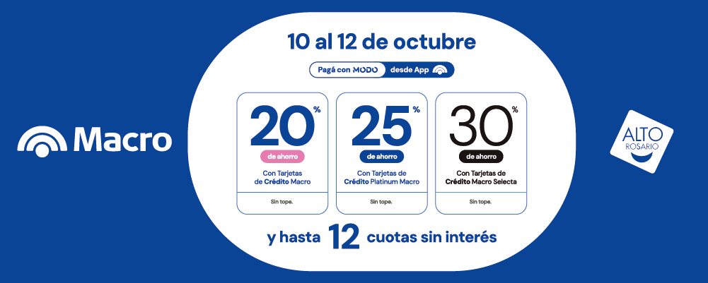 Cartera de consumo. Promoción válida del 10 al 12 de octubre de 2025 para compras que realicen en pagos presenciales con MODO desde la App Macro, en comercios adheridos de indumentaria, calzado, perfumerías y locales adheridos de shoppings seleccionados. 20% de ahorro con Tarjetas de Crédito Macro sin tope de devolución, y hasta 12 cuotas sin interés; 25% de ahorro con Tarjetas de Crédito Platinum Macro sin tope de devolución, y hasta 12 cuotas sin interés, y con Tarjetas de Crédito Macro Selecta adheridas a servicio Macro Selecta, 30% de ahorro sin tope de devolución, y hasta 12 cuotas sin interés. TNA (Tasa Nominal Anual) y CFTNA (Costo Financiero Total Nominal Anual) 0,00%. Descuento aplicable al cierre del resumen en el cual se registre la operación o en los dos siguientes. Para que aplique el beneficio el pago a comercios debe ser realizado con Tarjetas de Crédito de Banco Macro y tener cuenta abierta en Banco Macro asociada a MODO. Válido para consumo de tipo personal/familiar. No válido tarjeta empresa/agro. No aplica para pagos realizados a través de Mercado Pago/Todo Pago/pagos electrónicos inmediatos/transferencias 3.0. Establecimientos/productos/servicios que comercializan o la calidad de los mismos no son promocionados o garantizados por Banco Macro. Para conocer los comercios adheridos, más información y condiciones o limitaciones aplicables, consulte en forma previa a realizar la operación en www.macro.com.ar