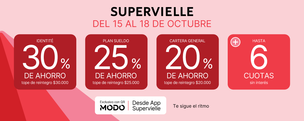 CARTERA CONSUMO. Banco Supervielle S.A., Reconquista 330, C.A.B.A., CUIT 33-50000517-9, Inscrip. I.G.J. N.° 23, F° 502, L. 45, T° A de Estatutos Soc. Vigente en la República Argentina del 15 al 18 de octubre de 2025. Consultar bases y condiciones en supervielle.com.ar/marcas y locales participantes en las promociones.