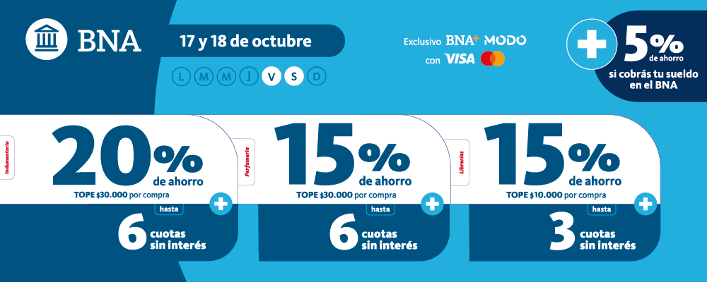 Este viernes 17 y sábado 18, pagando con MODO de Banco Nación, vas a poder aprovechar descuentos de hasta el 20% y hasta 6 CUOTAS SIN INTERES.