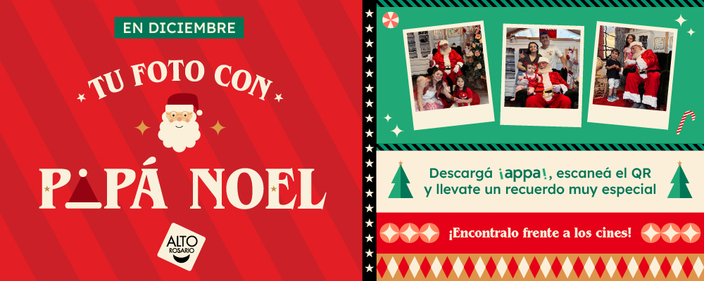 Del 8 al 23 de diciembre de (13 a 21 hs) y el 24 de Diciembre de (10 a 13 hs), venite al Shopping y encontranos frente a Los Cines para llevarte tu foto con PAPÁ NOEL.