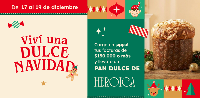 Del 17 al 19 de Diciembre, con tu factura de compra de $150.000 o más, acercate a nuestro Mercado Navideño frente a Los Cines de 16hs a 22hs y escaneando el QR con tu usuario de ¡appa!, llevate de regalo un Pan Dulce de Heroica para acompañar tu mesa dulce en estas fiestas.