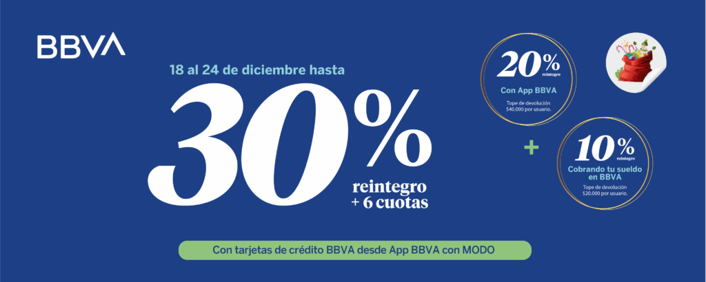 EN LOCALES ADHERIDOS. 20% DE REINTEGRO Y 6 CUOTAS SIN INTERÉS PARA COMPRAS REALIZADAS EXCLUSIVAMENTE CON QR MODO A TRAVÉS DE APP BBVA CON TARJETAS DE CRÉDITO VISA Y/O MASTERCARD EMITIDAS POR BBVA.TOPE DE REINTEGRO DE $40.000 POR USUARIO POR MES. 10% DE REINTEGRO ADICIONAL EXCLUSIVO PARA CLIENTES BBVA QUE ACREDITEN HABERES EN UNA CUENTA SUELDO ABIERTA EN BBVA CON TOPE DE REINTEGRO DE $20.000 POR CLIENTE POR MES. ES REQUISITO TENER UNA CAJA DE AHORRO EN PESOS ACTIVA EN BBVA VINCULADA A MODO PARA PODER RECIBIR LA ACREDITACIÓN DEL REINTEGRO. LAS COMPRAS REALIZADAS POR TUS ADICIONALES TAMBIÉN PARTICIPAN SI, AL MOMENTO DE LA COMPRA, SON TITULARES DE UNA CAJA DE AHORRO EN PESOS ACTIVA EN BBVA VINCULADA A MODO, Y PARA PODER RECIBIR EL REINTEGRO EXTRA, ADEMÁS, ACREDITAN HABERES EN UNA CUENTA SUELDO ABIERTA EN BBVA. NO PARTICIPAN TARJETAS VISA PURCHASING, DISTRIBUTION Y CORPORATE. EL REINTEGRO SE ACREDITARÁ DENTRO DE LOS 60 DÍAS POSTERIORES AL CIERRE DE LA LIQUIDACIÓN DONDE FIGURE EL CONSUMO, EN LA CAJA DE AHORRO BBVA EN PESOS BBVA VINCULADA A MODO Y SE APLICARÁ SOBRE EL PRECIO DE CONTADO. LA PROMOCIÓN NO APLICA A PAGOS REALIZADOS A TRAVÉS DE OTRAS BILLETERAS VIRTUALES Y/O PLATAFORMAS DE PAGO ONLINE (POR EJEMPLO, PAYPAL, TODO PAGO, MERCADO PAGO, UALÁ, ETC.). LA PRESENTE PROMOCIÓN ES VÁLIDA SÓLO PARA CONSUMOS DE TIPO FAMILIAR, Y NO SE ACUMULA A OTRAS PROMOCIONES. EJEMPLO: EN UNA COMPRA DE $60.000 REALIZADA EN 6 PAGOS CON TARJETA DE CRÉDITO A TRAVÉS DE QR MODO, RECIBIRÁ DEL PRIMER AL SEXTO RESUMEN DE SU TARJETA UN CONSUMO DE $10.000 Y DENTRO DE LOS 60 DÍAS POSTERIORES AL CIERRE DE LA LIQUIDACIÓN DONDE FIGURE EL CONSUMO, UN REINTEGRO DE $12.000 EN LA CAJA DE AHORRO EN PESOS ACTIVA EN BBVA VINCULADA A MODO CORRESPONDIENTE A LA PROMOCIÓN DEL 20% DE REINTEGRO Y OTRO DE $6.000 CORRESPONDIENTE AL 10% DE REINTEGRO ADICIONAL PARA CLIENTES PLAN SUELDO. LOS ACCIONISTAS DE BANCO BBVA ARGENTINA S.A. LIMITAN SU RESPONSABILIDAD A LA INTEGRACIÓN DE LAS ACCIONES SUSCRIPTAS A LA LEY 19.550 Y LEY 25.738. CUIT 30-50000319-3. AVDA. CÓRDOBA 111- PISO 31 CABA – CP C1054AAA